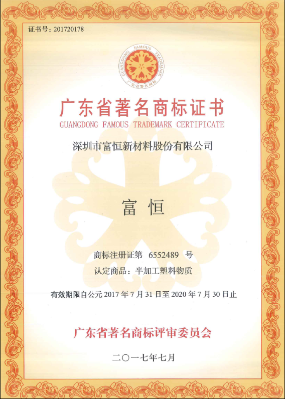 富恒在多年跨越式发展中,自主创立“富恒”品牌,并致力于品牌的自主化和国际化建设。富恒专注高性能新材料的科研、生产、销售和服务,致力于改性塑料技术研究与应用,公司依靠着先进的研发理念、全面的人才队伍建设和良好的软硬件配置保障了在本行业领先的地位。本次评定从富恒品牌的知名度、销售领域、市场占有率、产品质量、售后服务等多方面进行考核,凭借各方面的优势,富恒通过了省评委委员会专家一致认可,最终收获广东省著名商标的美誉。广东省著名商标评审委员会对“富恒”的认定是富恒品牌建设之路自主化和国际化的证明。随着科技的发展,富恒始终站在改性塑料技术创新的前沿,立志成为中国企业国际化产业的典范!