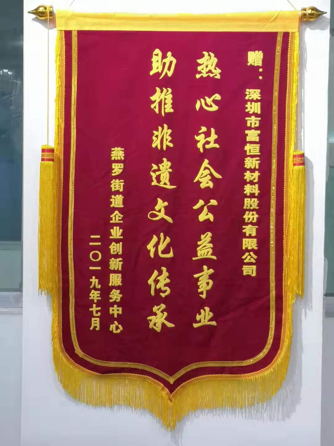 收到燕罗街道企业创新服务中心赠予我司“热心社会公益事业,助推非遗文化传承”锦旗一面。