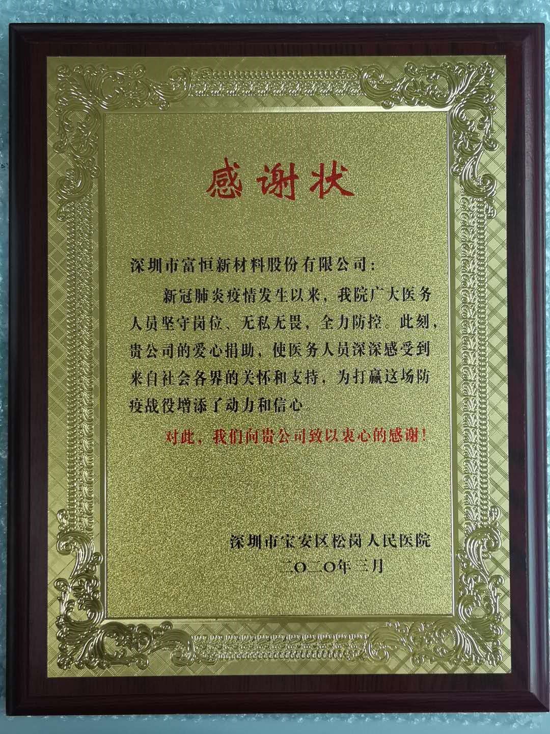新冠肺炎疫情,既是一次危机,也是一次大考,大事难事看担当,逆境顺境看襟度。富恒知重负重,知难不难,公司全体同仁团结一心,攻克时艰,积极参与医疗物资和设备的配套生产,尽力满足疫情防控的需求;同时爱心捐助松岗人民医院5万善款,为打赢这场防疫战役增添了动力和信心。富恒同仁万众一心,奋力夺取此次疫情防控和复工复产的全面胜利。